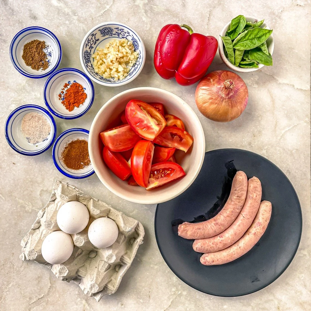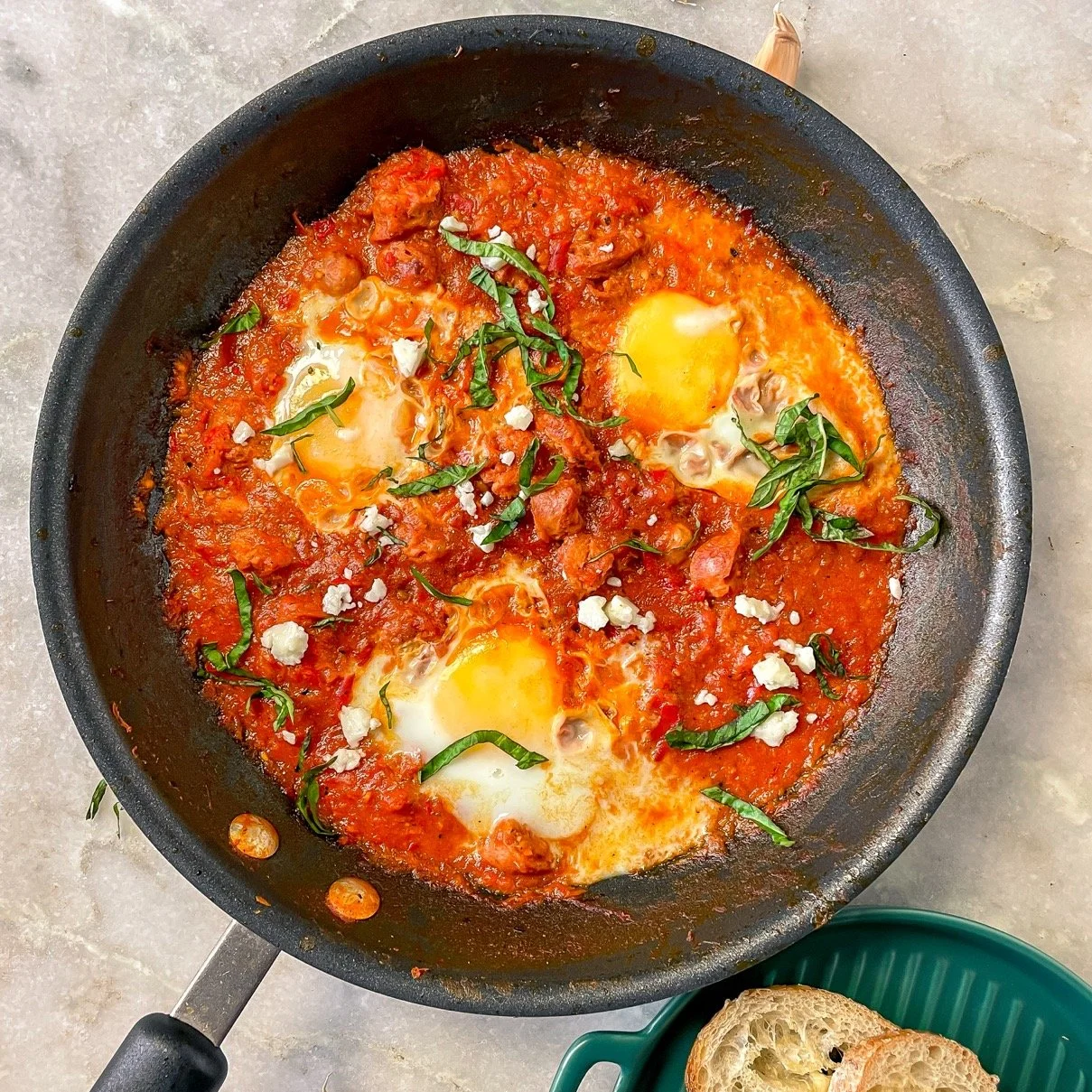Place it back on the stovetop and add the sausage back. Use a large spoon to make small wells in the sauce and crack the eggs into each well. Cover the pan and cook for 5-8 minutes or until the eggs are done to your liking.