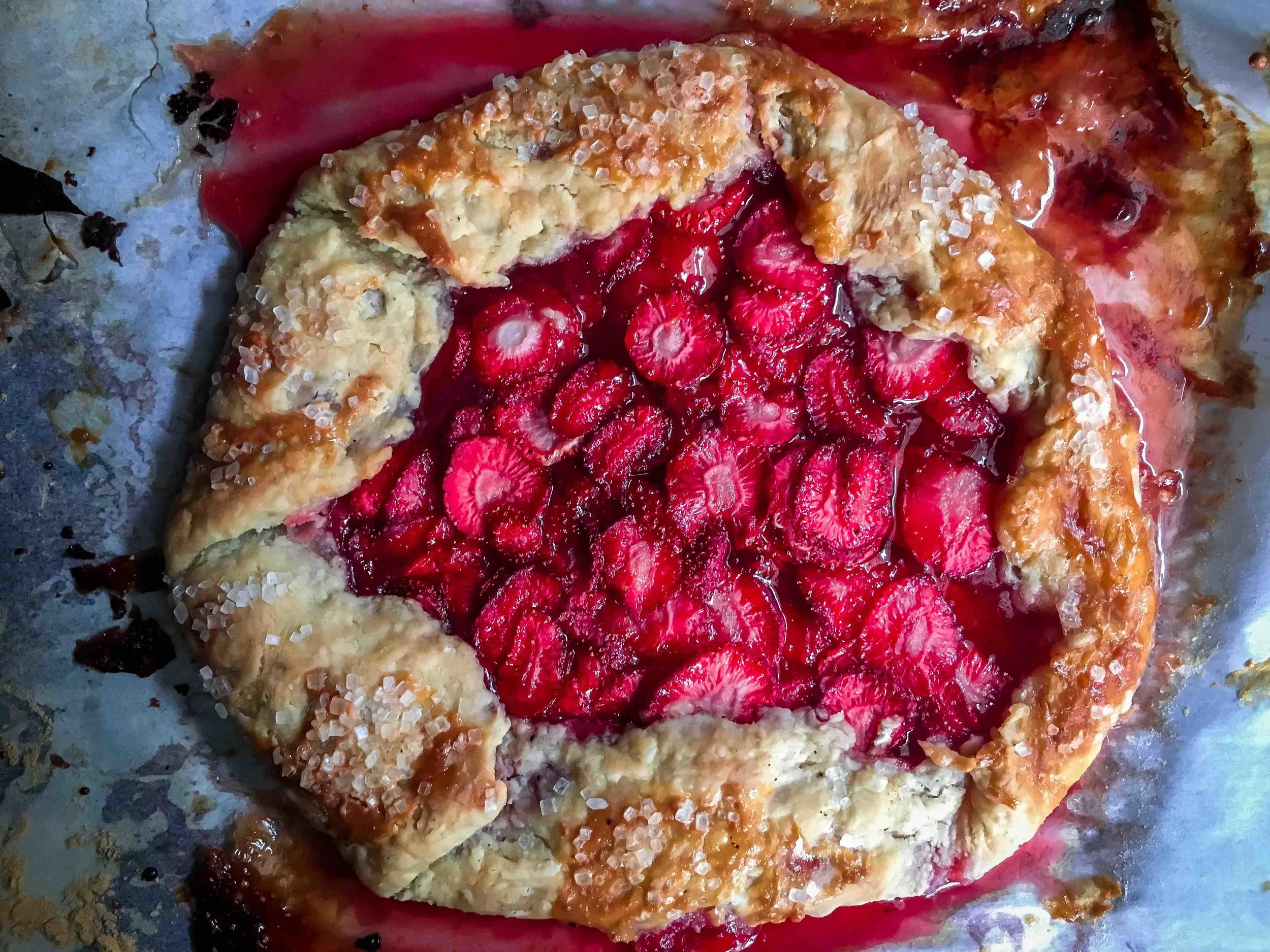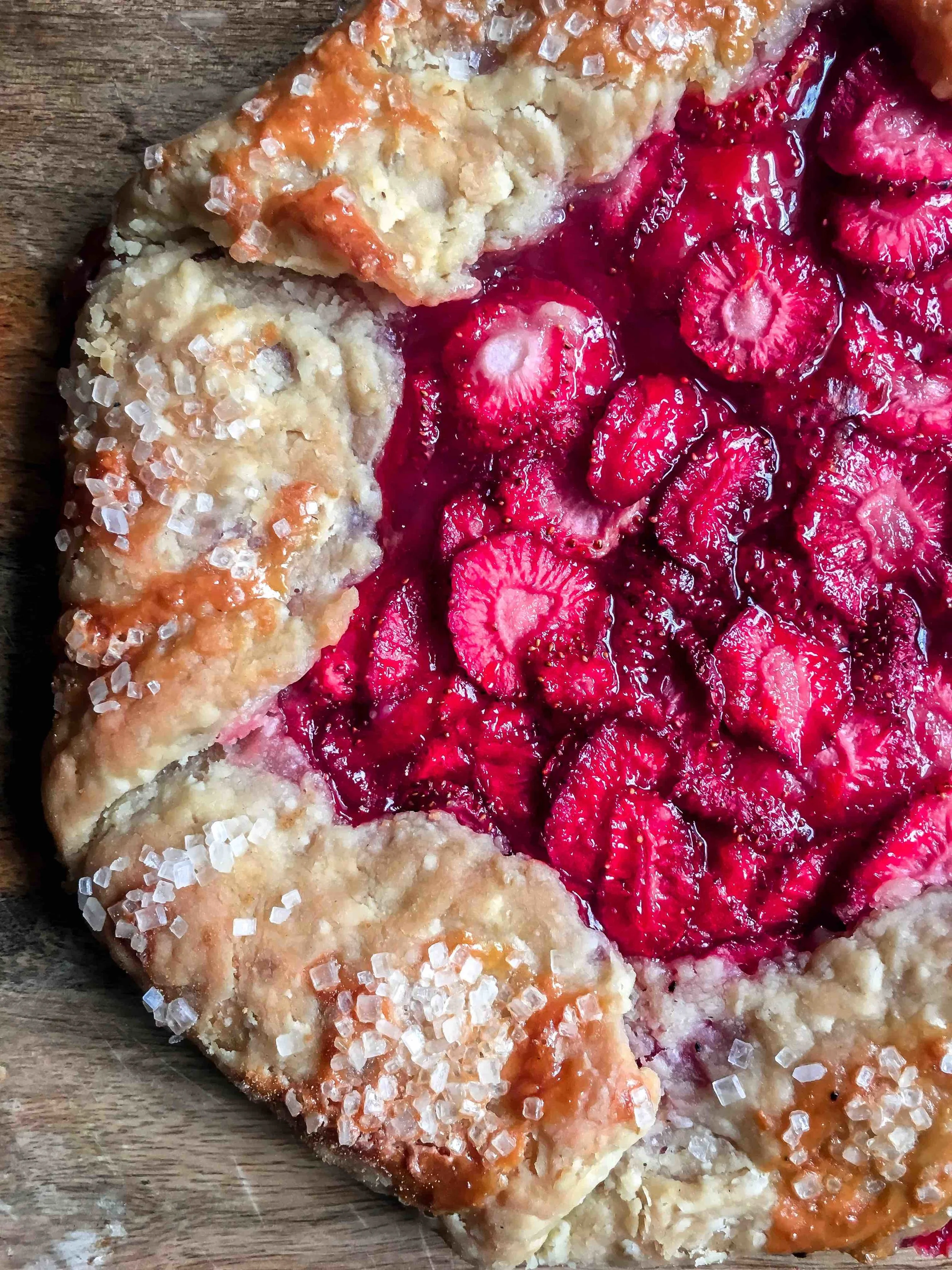 My love affair with strawberries began after having a scoop of their strawberry ice cream. Velvet soft yet dense with actual texture from the seeds that bejewel the fruit placed on a cheap almost plastic like cone that alone tasted like cardboard but after the ice cream drizzled its sweet myrrh all over it, tasted as resistible as the thing that it tried to keep afloat. As I grew up, so did my tastes. Soon the strawberry flavor became too sweet, I moved to butterscotch which had the same sugary outcome. This is when I was introduced to deeper, richer flavors of chocolate & coffee: things that please my buds to date. Its this change that has reduced my visits to the now ever unpopular ice cream chain. However, a dish like this galette brings back the same flavors, joy, and energy as eight year old Archit had who wanted a treat after acing his english class dictation. This dessert was therefore an ode to those times. A realization that no matter how old you get, your childhood lives on within you.